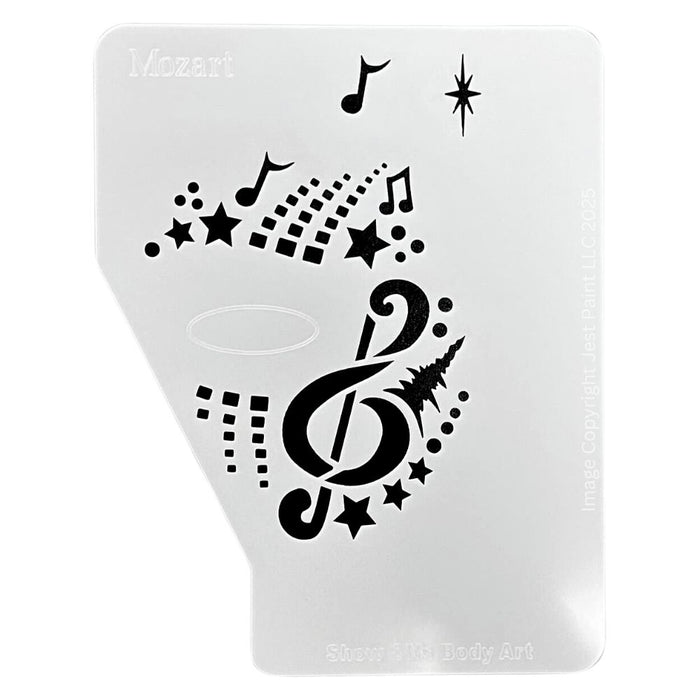 The Mozart Profile Eyes Stencil can be used around one eye or both. Featuring musical notes, stars and other shapes, this set makes it easy to create fun, expressive looks that everyone will love!