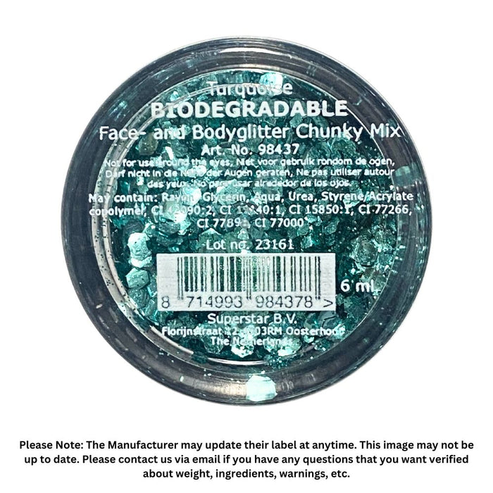 The TURQUOISE glitter mix is perfect for flowers, dragons, mermaids and frozen princess faces! Chunky Glitters are also great for teens and adults looking for festival make up looks. Superstar Biodegradable Chunky Glitters combos were designed by the amazing Dutch Glitter Queen Sabine Gabrielle Vogel. Biodegradable Glitters are perfect for those wanting to decrease the amount of plastic in the oceans! With only a small amount of plastic and with the PROVEN high biodegradation performance of 90% in fresh water, Superstar Biodegradable Glitter is the most bio friendly glitter on the market. See more information below. It is great for festivals where regular glitter is not permitted. You can apply it on top of strands of hair coated in aloe or hair gel too!