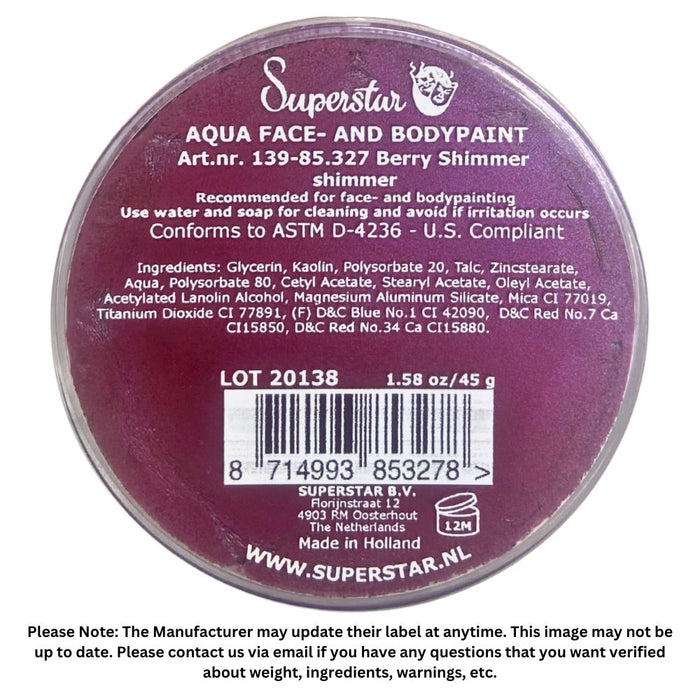 Recommended for face and body painting. Use water and soap for cleaning and avoid if irritation occurs. Conforms to ASTM D-4236 - U.S. Compliant. May leave a color trace. Made in Holland. Gluten free, Perfume free and not tested on animals. Use within 12 months after it has been opened. Because this product can stain other surfaces, please avoid contact with carpets, fabrics and upholstery. Access Superstar MSDS here