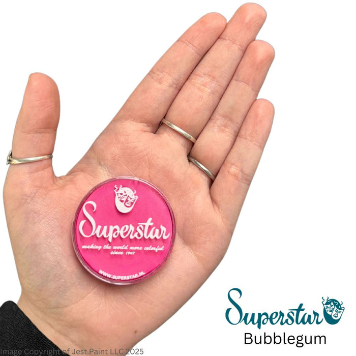Superstar is a highly pigmented smooth and creamy face paint. They blend easily, dry within 30 seconds on the skin and dry to a smudge free coverage. Superstar Bubblegum is a fresh light pink, perfect for use around the eyes for butterflies, and for blending into darker pinks and purples for pretty full face gradients. Try the 16 gram container if you want to test it out.