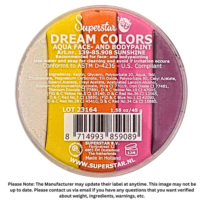 The Superstar paint line includes over 80 bold colors including shimmer and glitter colors. Superstar face paints are vibrant and bold and have a creamy consistency. Superstar face paints are made in the Netherlands with EU and USA FDA compliant ingredients. Store at room temperature, keep out of direct sunlight.