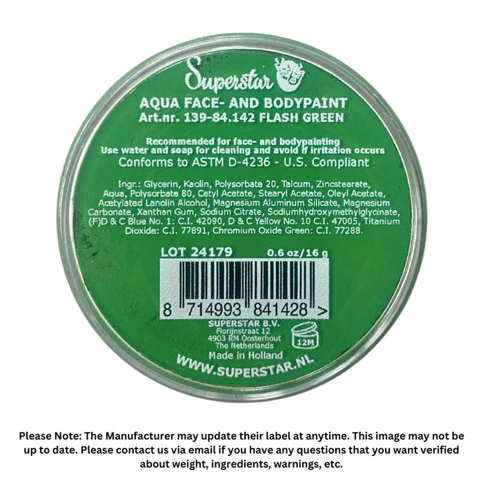 Recommended for face and body painting. Use water and soap for cleaning and avoid if irritation occurs. Conforms to ASTM D-4236 - U.S. Compliant. May leave a color trace. Made in Holland. Gluten free, Perfume free and not tested on animals. Use within 12 months after it has been opened. Because this product can stain other surfaces, please avoid contact with carpets, fabrics and upholstery. Access Superstar MSDS here
