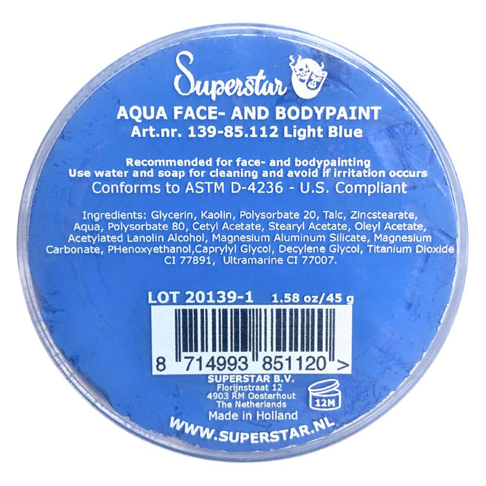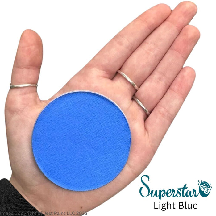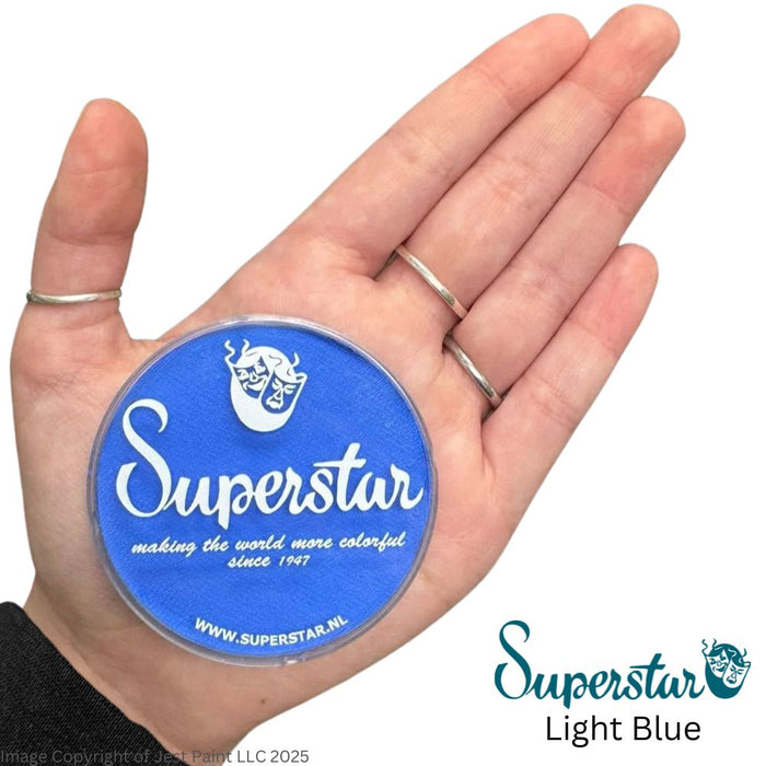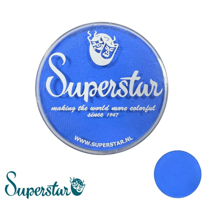 Superstar is a highly pigmented smooth and creamy face paint. They blend easily, dry within 30 seconds on the skin and dry to a smudge free coverage. Superstar Light Blue is a very pigmented shade that looks great in conjunctions with darker blues, greens and purples. Not quite a royal blue, but not a pastel blue, this is perfect for certain super heroes, wild cats, and sports designs. You can go pro with this Superstar Light Blue in the 45 gram container.