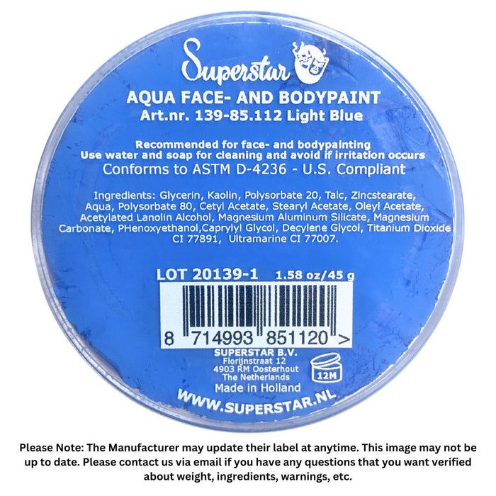 Recommended for face and body painting. Use water and soap for cleaning and avoid if irritation occurs. Conforms to ASTM D-4236 - U.S. Compliant. May leave a color trace. Made in Holland. Gluten free, Perfume free and not tested on animals. Use within 12 months after it has been opened. Because this product can stain other surfaces, please avoid contact with carpets, fabrics and upholstery. Access Superstar MSDS here