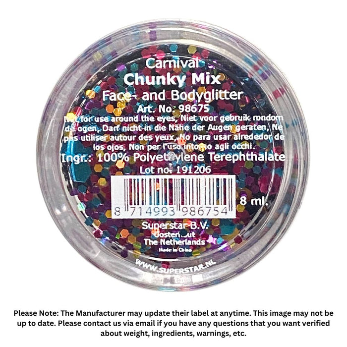 Superstar Chunky Glitters are made of 100% Polyethylene Terephtalate in various sizes and safe to use on skin and hair.