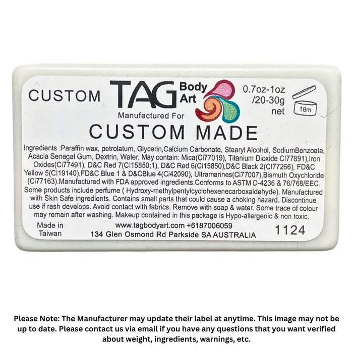All regular colors are made with FDA compliant ingredients and are hypoallergenic. TAG cakes are made in Taiwan under the direction of TAG Body Art in Australia. They contain no parabens or lanolin to reduce the risk of allergic reactions. TAG cakes are vegan and they are not tested on animals.