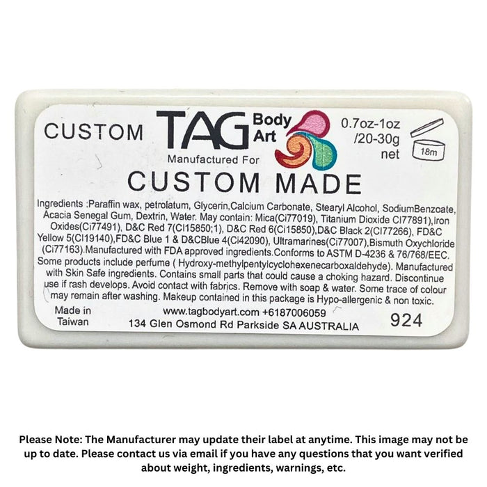 All regular colors are made with FDA compliant ingredients and are hypoallergenic. TAG cakes are made in Taiwan under the direction of TAG Body Art in Australia. They contain no parabens or lanolin to reduce the risk of allergic reactions. TAG cakes are vegan and they are not tested on animals.