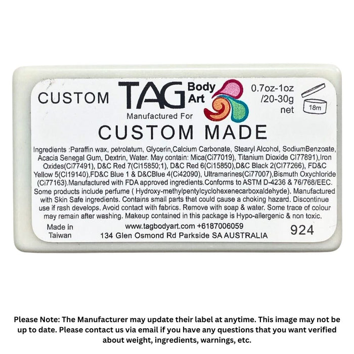 All regular colors are made with FDA compliant ingredients and are hypoallergenic. TAG cakes are made in Taiwan under the direction of TAG Body Art in Australia. They contain no parabens or lanolin to reduce the risk of allergic reactions. TAG cakes are vegan and they are not tested on animals.