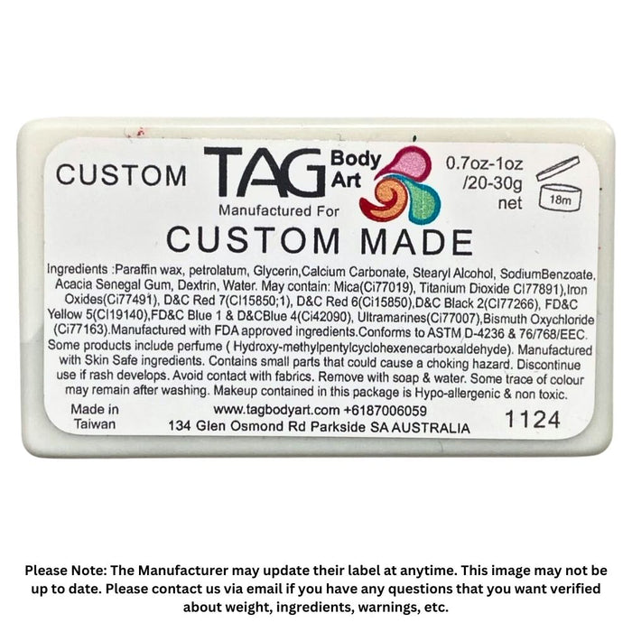 All regular colors are made with FDA compliant ingredients and are hypoallergenic. TAG cakes are made in Taiwan under the direction of TAG Body Art in Australia. They contain no parabens or lanolin to reduce the risk of allergic reactions. TAG cakes are vegan and they are not tested on animals.