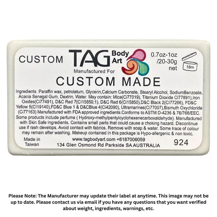 All regular colors are made with FDA compliant ingredients and are hypoallergenic. TAG cakes are made in Taiwan under the direction of TAG Body Art in Australia. They contain no parabens or lanolin to reduce the risk of allergic reactions. TAG cakes are vegan and they are not tested on animals.