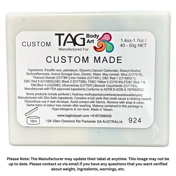 All regular colors are made with FDA compliant ingredients and are hypoallergenic. TAG cakes are made in Taiwan under the direction of TAG Body Art in Australia. They contain no parabens or lanolin to reduce the risk of allergic reactions. TAG cakes are vegan and they are not tested on animals.
