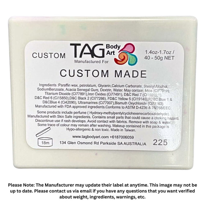 All regular colors are made with FDA compliant ingredients and are hypoallergenic. TAG cakes are made in Taiwan under the direction of TAG Body Art in Australia. They contain no parabens or lanolin to reduce the risk of allergic reactions. TAG cakes are vegan and they are not tested on animals.