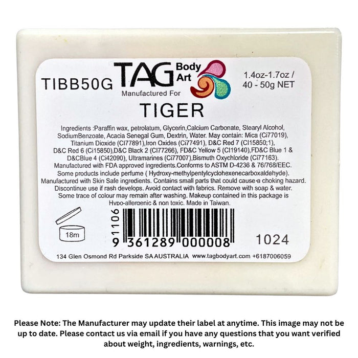 All regular colors are made with FDA compliant ingredients and are hypoallergenic. TAG cakes are made in Taiwan under the direction of TAG Body Art in Australia. They contain no parabens or lanolin to reduce the risk of allergic reactions. TAG cakes are vegan and they are not tested on animals.