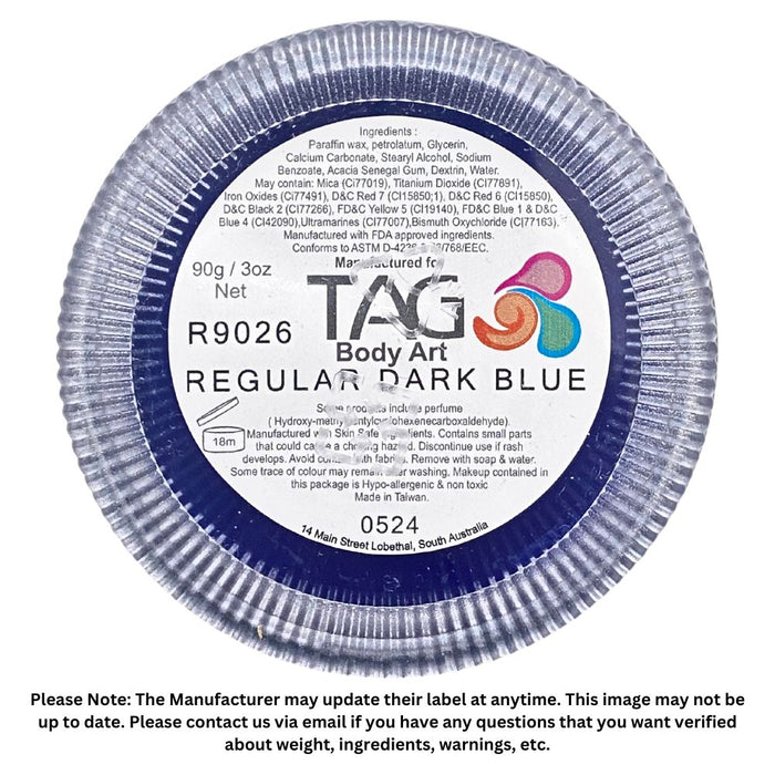 La pintura facial TAG Body Art Dark Blue es perfecta para crear bases uniformes y para obtener trazos perfectos al usar un pincel fino para tus delineados. Las pinturas TAG son ideales para pintacaritas principiantes y profesionales, así como para el cosplayer profesional y padres que necesitan un producto de maquillaje artístico de muy buena calidad pero asequible para su disfraz, kit de pintura facial, fiesta o simplemente por diversión. Las pinturas faciales TAG Body Art son colores brillantes y altamente pigmentados, hacen que cada diseño se destaque. TAG Dark Blue es un hermoso azul oscuro perfecto para superhéroes, diseños inspirados en hielo, incluso como sustituto del negro. Como es altamente pigmentado, puede ser un poco más difícil de lavar que otros colores.