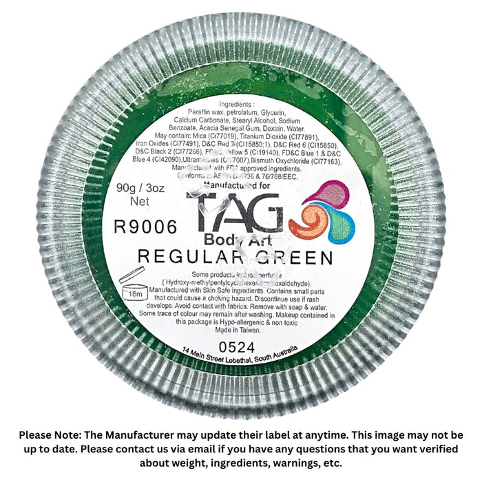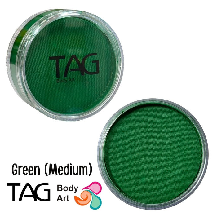 TAG Body Art Medium Green face paint is perfect for creating even bases and for obtaining perfect strokes when using a fine brush for your line work. TAG Face Paints are great for beginner and professional face painters as well as the professional cosplayer and parents who need a very good quality but affordable face painting product for their costume, face painting kit, party or just for fun. TAG Body Art face paints bright and highly pigmented colors make every design stand out. TAG Medium Green is a very bright and opaque green. It is great for monster faces, lizards and leaves.