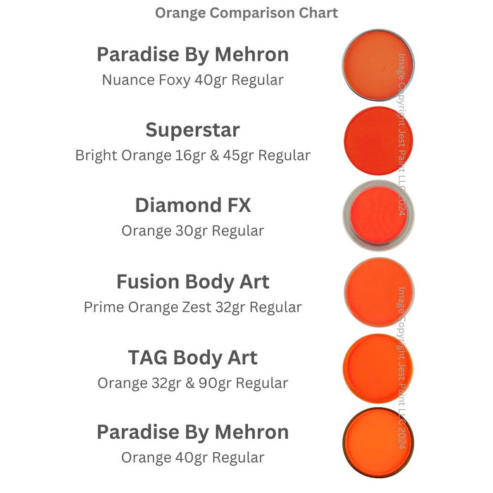 TAG Body Art Orange face paint is perfect for creating even bases and for obtaining perfect strokes when using a fine brush for your line work. TAG Face Paints are great for beginner and professional face painters as well as the professional cosplayer and parents who need a very good quality but affordable face painting product for their costume, face painting kit, party or just for fun. TAG Body Art face paints bright and highly pigmented colors make every design stand out. TAG Orange is nice and bright, a perfect orange for tiger faces.