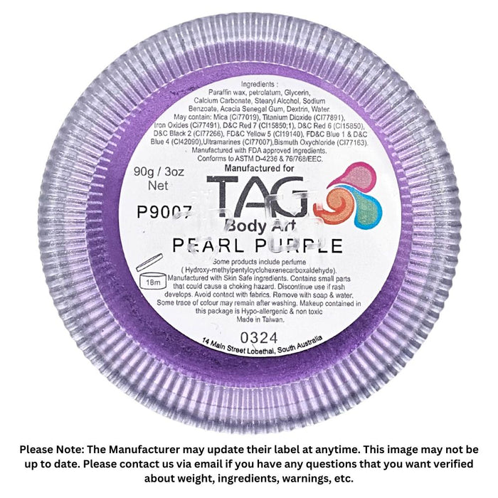 All pearl colors are made with FDA compliant ingredients and are hypoallergenic. TAG cakes are made in Taiwan under the direction of TAG Body Art in Australia. They contain no parabens or lanolin to reduce the risk of allergic reactions. TAG cakes are vegan and they are not tested on animals.