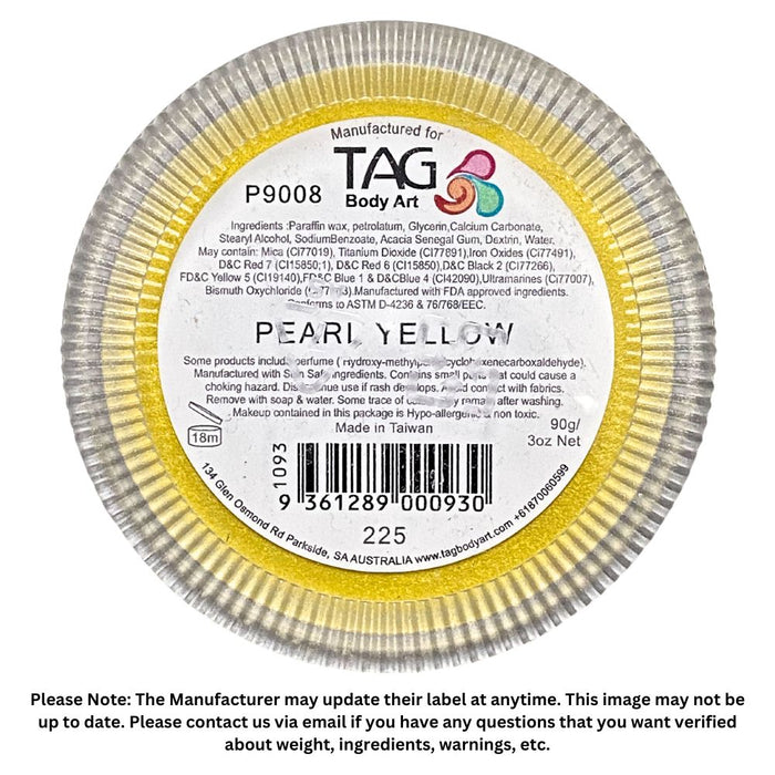 All pearl colors are made with FDA compliant ingredients and are hypoallergenic. TAG cakes are made in Taiwan under the direction of TAG Body Art in Australia. They contain no parabens or lanolin to reduce the risk of allergic reactions. TAG cakes are vegan and they are not tested on animals.