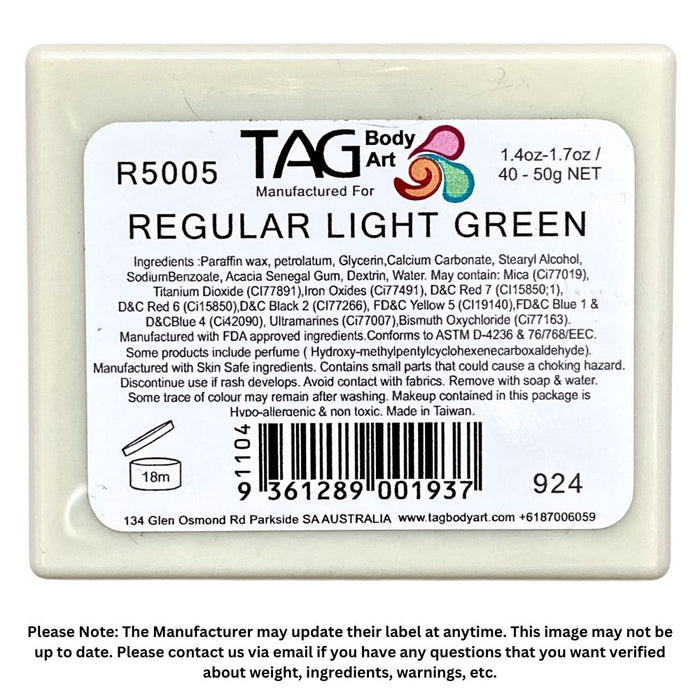 TAG Body Art Light Green face paint is perfect for creating even bases and for obtaining perfect strokes when using a fine brush for your line work. TAG Face Paints are great for beginner and professional face painters as well as the professional cosplayer and parents who need a very good quality but affordable face painting product for their costume, face painting kit, party or just for fun. TAG Body Art face paints bright and highly pigmented colors make every design stand out.