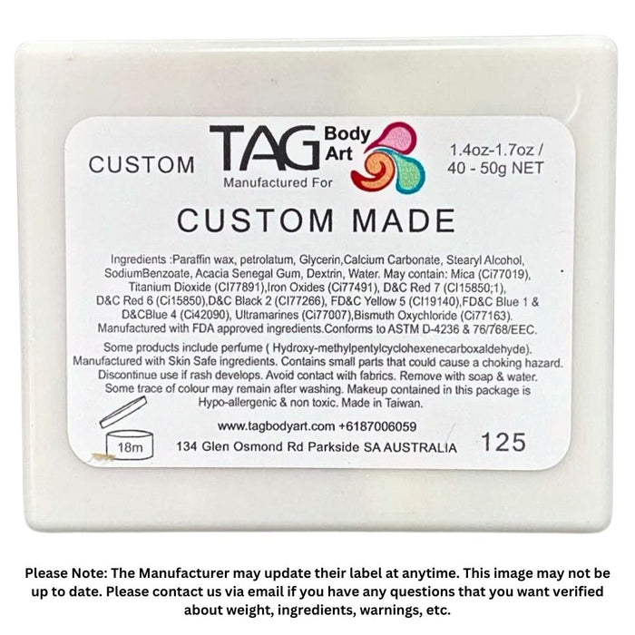 All regular colors are made with FDA compliant ingredients and are hypoallergenic. TAG cakes are made in Taiwan under the direction of TAG Body Art in Australia. They contain no parabens or lanolin to reduce the risk of allergic reactions. TAG cakes are vegan and they are not tested on animals.