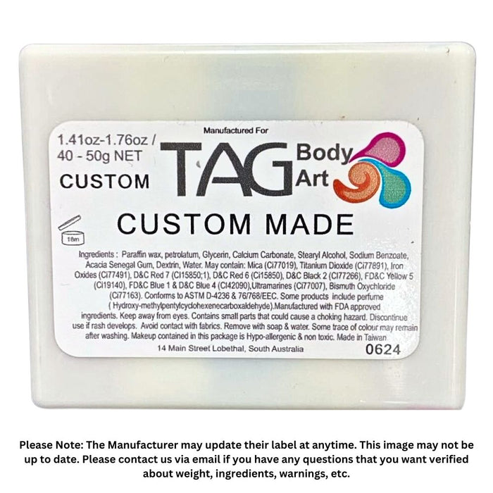 All regular colors are made with FDA compliant ingredients and are hypoallergenic. TAG cakes are made in Taiwan under the direction of TAG Body Art in Australia. They contain no parabens or lanolin to reduce the risk of allergic reactions. TAG cakes are vegan and they are not tested on animals.