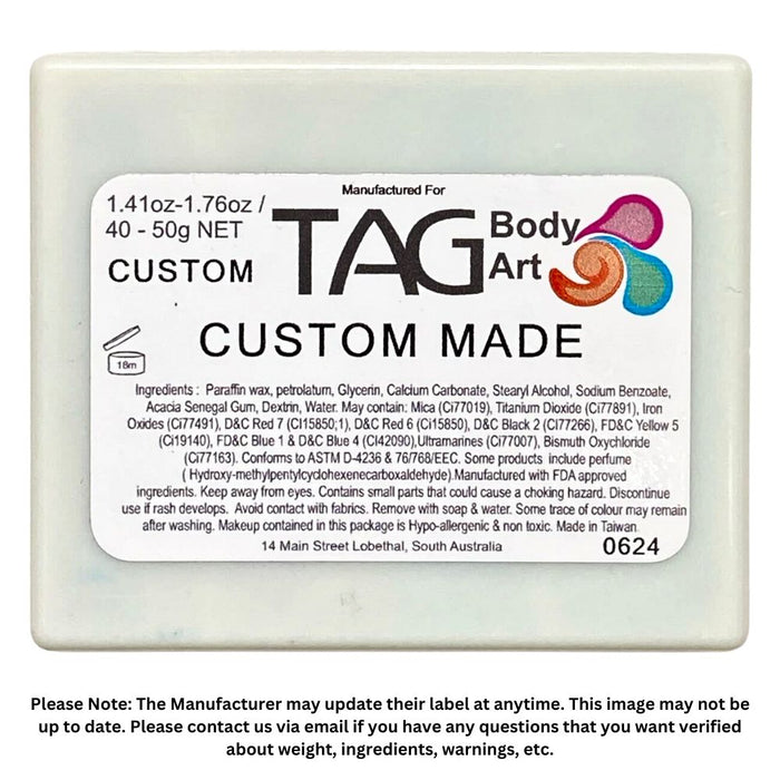 All regular colors are made with FDA compliant ingredients and are hypoallergenic. TAG cakes are made in Taiwan under the direction of TAG Body Art in Australia. They contain no parabens or lanolin to reduce the risk of allergic reactions. TAG cakes are vegan and they are not tested on animals.