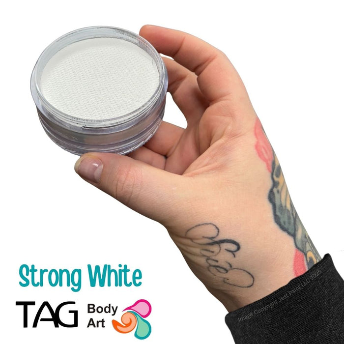 TAG Body Art white face paint is perfect for creating even bases and for obtaining perfect strokes when using a fine brush for your line work. This white looks almost the same in the container as TAG's regular white, but according to the manufacturer, it has a denser amount of white pigment, that is a higher quality, which dries brighter on the skin. TAG Face Paints are great for beginner and professional face painters as well as the professional cosplayer and parents who need a very good quality but affordable face painting product for their costume, face painting kit, party or just for fun. TAG Body Art face paints bright and highly pigmented colors make every design stand out.