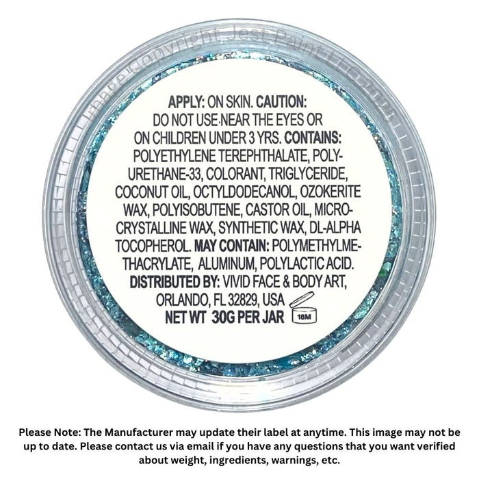 Polyester Glitter in varied shapes and size. Glitter Creme Contains: Polyethylene Terephthatlate, Polyurethane-33, Colorant, triglyceride, coconut oil, octyldodecanol, ozokerite wax (paraffin wax), polyisobutene, castor oil, microcrystalline wax, synthetic wax, dl alpha tocopherol. May contain Polymethyl Methacrylate, Aluminum, Polylactic Acid. Distributed by VIVID FACE and BODY ART Orlando Florida, 32829 USA Net Wt. 10gr per jar.
