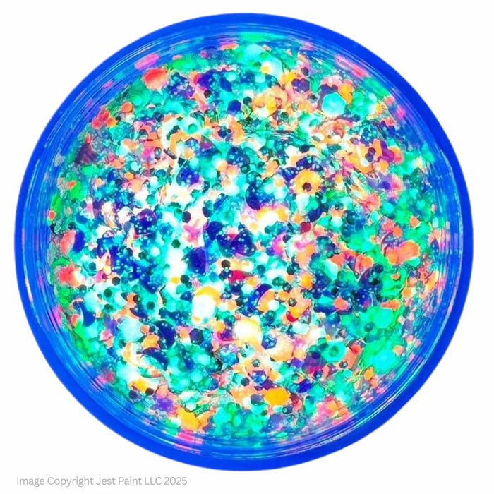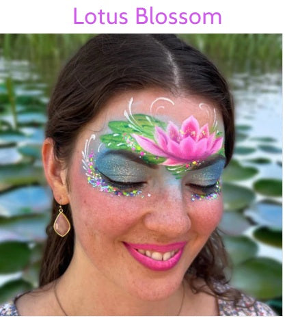 Large Lotus Blossom has hearts, stars and hexagons. It is filled with pink, purple, lime green and light blue glitter! Lotus Blossom looks amazing on top of dark line work, or as fun addition to flowers, rainbows, butterflies, unicorn manes, and fairy and princess eye masks. You can streak it in the hair and on the body. The 30gr jar is great for professional face and body painters who want to test out this amazing product! A little goes a long way!