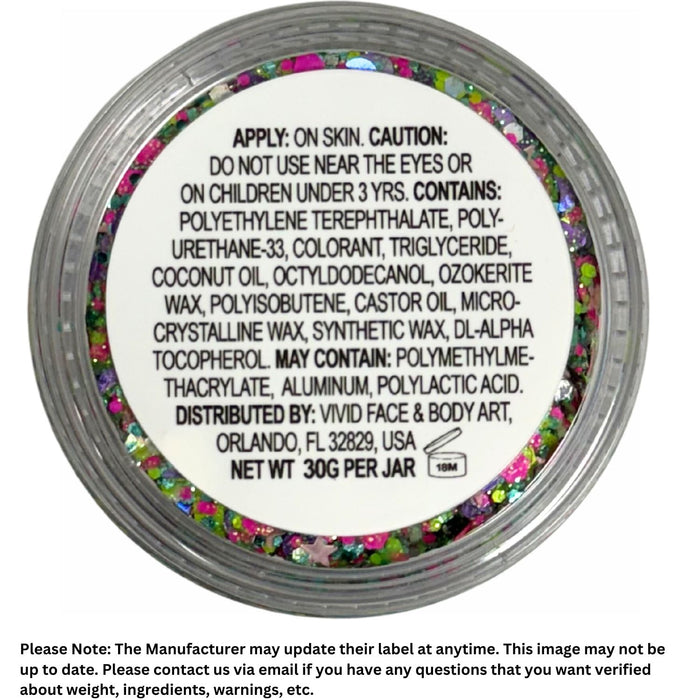 Polyester Glitter in varied shapes and size. Glitter Cream Contains: Polyethylene Terephthatlate, Polyurethane-33, Colorant, triglyceride, coconut oil, octyldodecanol, ozokerite wax (paraffin wax), polyisobutene, castor oil, microcrystalline wax, synthetic wax, dl alpha tocopherol. May contain Polymethyl Methacrylate, Aluminum, Polylactic Acid. Distributed by VIVID FACE and BODY ART Orlando Florida, 32829 USA Net Wt. 10gr per jar.