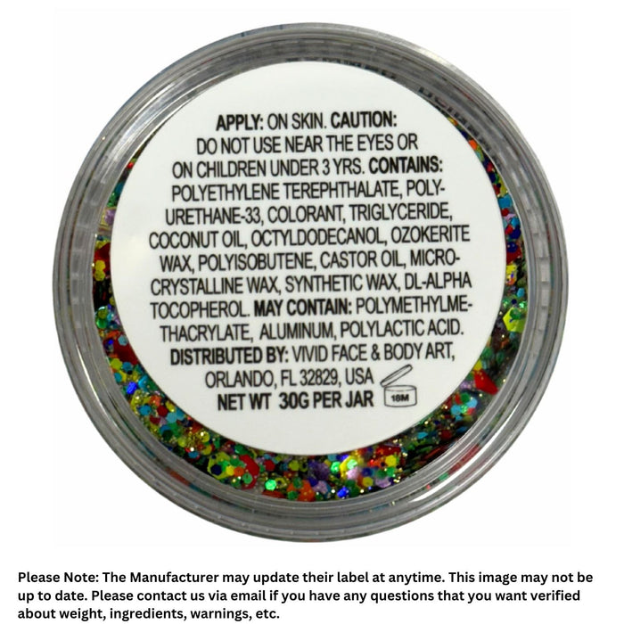Polyester Glitter in varied shapes and size. Glitter Cream Contains: Polyethylene Terephthatlate, Polyurethane-33, Colorant, triglyceride, coconut oil, octyldodecanol, ozokerite wax (paraffin wax), polyisobutene, castor oil, microcrystalline wax, synthetic wax, dl alpha tocopherol. May contain Polymethyl Methacrylate, Aluminum, Polylactic Acid. Distributed by VIVID FACE and BODY ART Orlando Florida, 32829 USA Net Wt. 10gr per jar.