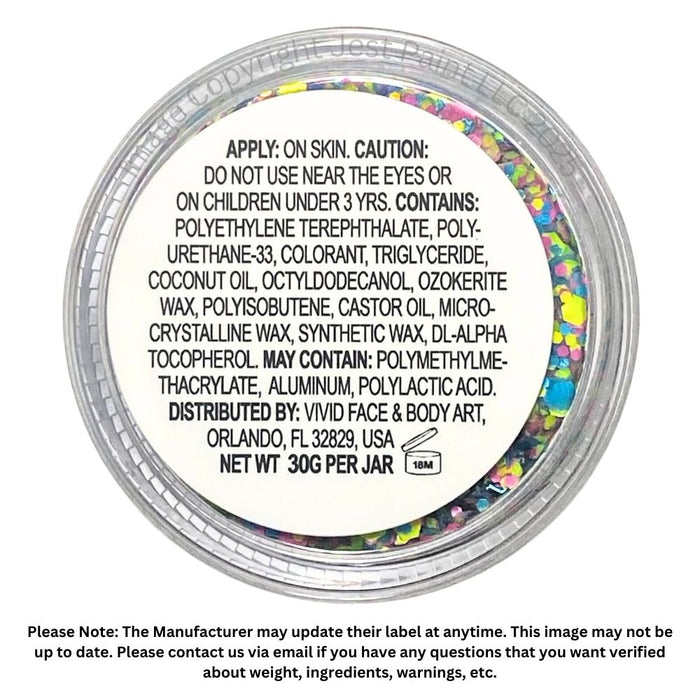 Polyester Glitter in varied shapes and size. Glitter Cream Contains: Polyethylene Terephthatlate, Polyurethane-33, Colorant, triglyceride, coconut oil, octyldodecanol, ozokerite wax (paraffin wax), polyisobutene, castor oil, microcrystalline wax, synthetic wax, dl alpha tocopherol. May contain Polymethyl Methacrylate, Aluminum, Polylactic Acid. Distributed by VIVID FACE and BODY ART Orlando Florida, 32829 USA Net Wt. 10gr per jar.