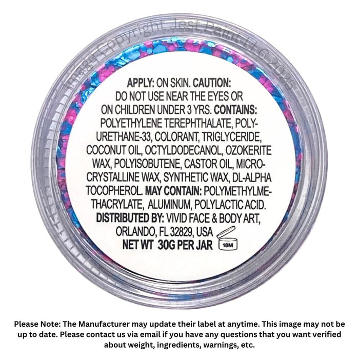 Polyester Glitter in varied shapes and size. Glitter Creme Contains: Polyethylene Terephthatlate, Polyurethane-33, Colorant, triglyceride, coconut oil, octyldodecanol, ozokerite wax (paraffin wax), polyisobutene, castor oil, microcrystalline wax, synthetic wax, dl alpha tocopherol. May contain Polymethyl Methacrylate, Aluminum, Polylactic Acid. Distributed by VIVID FACE and BODY ART Orlando Florida, 32829 USA Net Wt. 10gr per jar.
