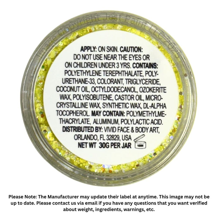 Polyester Glitter in varied shapes and size. Glitter Creme Contains: Polyethylene Terephthatlate, Polyurethane-33, Colorant, triglyceride, coconut oil, octyldodecanol, ozokerite wax (paraffin wax), polyisobutene, castor oil, microcrystalline wax, synthetic wax, dl alpha tocopherol. May contain Polymethyl Methacrylate, Aluminum, Polylactic Acid. Distributed by VIVID FACE and BODY ART Orlando Florida, 32829 USA Net Wt. 10gr per jar.