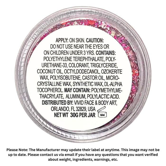 Polyester Glitter in varied shapes and size. Glitter Creme Contains: Polyethylene Terephthatlate, Polyurethane-33, Colorant, triglyceride, coconut oil, octyldodecanol, ozokerite wax (paraffin wax), polyisobutene, castor oil, microcrystalline wax, synthetic wax, dl alpha tocopherol. May contain Polymethyl Methacrylate, Aluminum, Polylactic Acid. Distributed by VIVID FACE and BODY ART Orlando Florida, 32829 USA Net Wt. 10gr per jar.