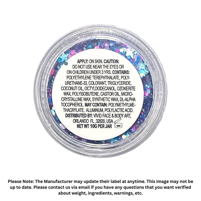 Polyester Glitter in varied shapes and size. Glitter Cram Contains: Polyethylene Terephthatlate, Polyurethane-33, Colorant, triglyceride, coconut oil, octyldodecanol, ozokerite wax (paraffin wax), polyisobutene, castor oil, microcrystalline wax, synthetic wax, dl alpha tocopherol. May contain Polymethyl Methacrylate, Aluminum, Polylactic Acid. Distributed by VIVID FACE and BODY ART Orlando Florida, 32829 USA Net Wt. 10gr per jar.