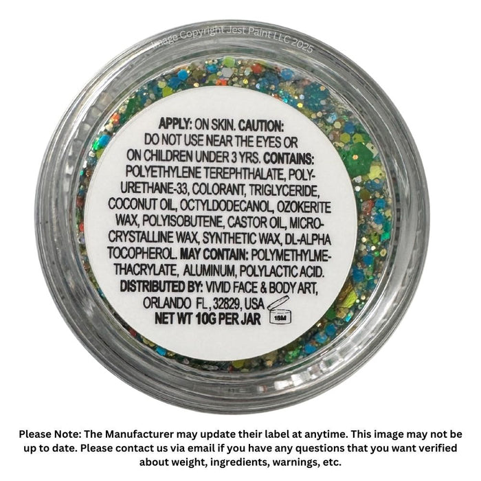 Polyester Glitter in varied shapes and size. Glitter Creme Contains: Polyethylene Terephthatlate, Polyurethane-33, Colorant, triglyceride, coconut oil, octyldodecanol, ozokerite wax (paraffin wax), polyisobutene, castor oil, microcrystalline wax, synthetic wax, dl alpha tocopherol. May contain Polymethyl Methacrylate, Aluminum, Polylactic Acid. Distributed by VIVID FACE and BODY ART Orlando Florida, 32829 USA Net Wt. 10gr per jar.