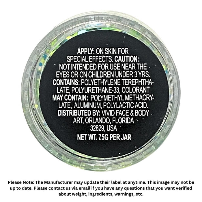 Polyester Glitter in varied shapes and size. Contains: Polyethylene Terephthatlate, Polyurethane-33, Colorant. May contain Polymethyl Methacrylate, Aluminum, Polylactic Acid. Distributed by VIVID FACE and BODY ART Orlando Florida, 32829 USA Net Wt. 7.5g per jar.