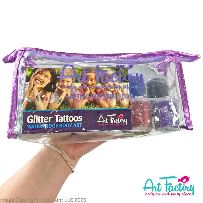 The Art Factory has been producing high quality glitter tattoo kits for years. The polyester cosmetic grade glitter and medical grade body glue is safe for use on the face and body.